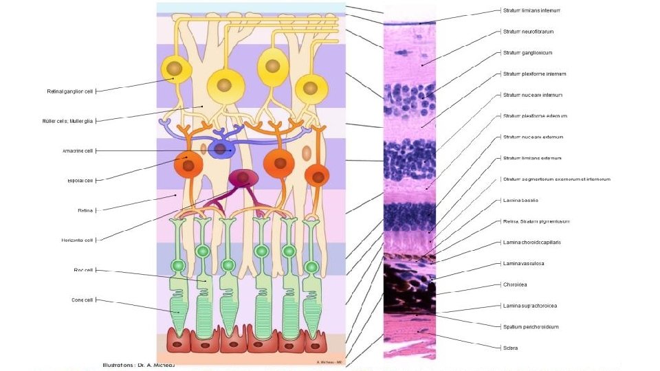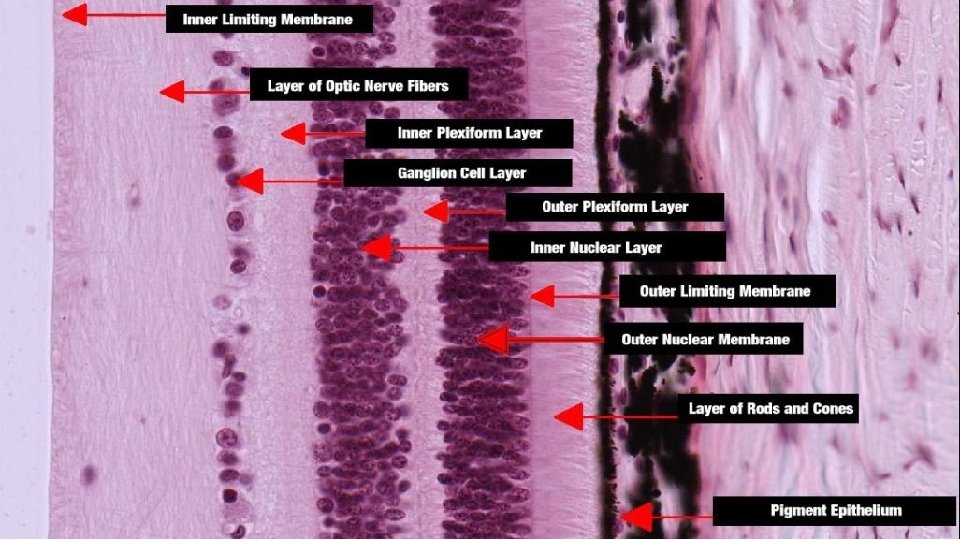1. STRATUM PIGMENTOSUM 2. STRATUM NERVOSUM 3. STRATUM LIMITANS EXTERNA 4. STRATUM NUCLEARE EXTERNA 5. STRATUM PLEXIFORMIS EXTERNA 6. STRATUM NUCLEARE INTERNA 7. STRATUM PLEXIFORMIS INTERNA 8. STRATUM GANGLIONARE 9. STRATUM NEUROFIBRARUM 10. STRATUM LIMITANS INTERNA