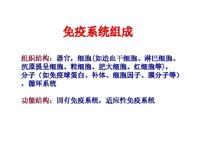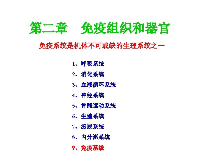 免疫器官 Organs of the Immune System 中枢免疫器官 (Central lymphoid organ)或初 级淋巴器官(Primary lymphoid organ) Organ or tissue that provides a microenvironment necessary for lymphocytes maturation 外周免疫器官 (Peripheral lymphoid organ)
