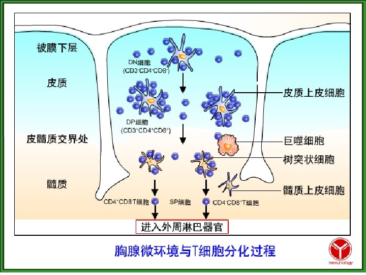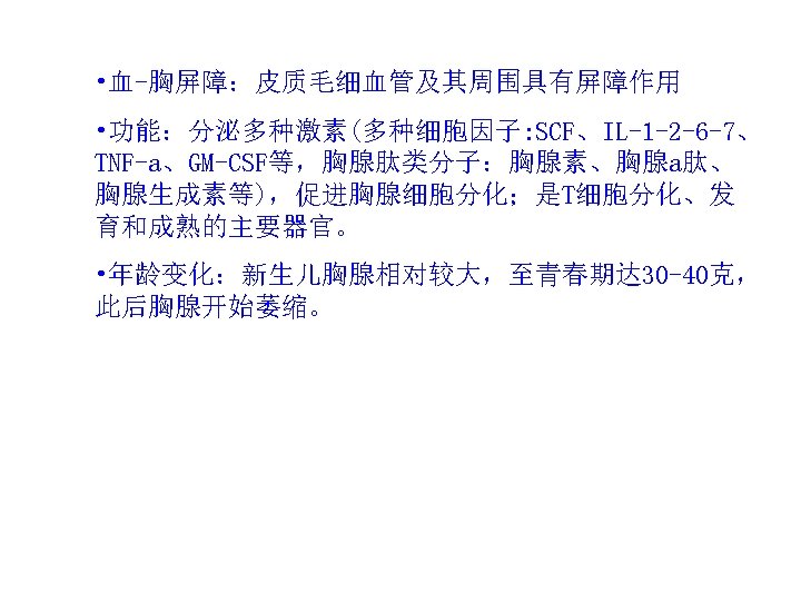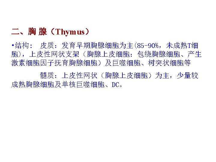 胸腺的组织结构Thymic Tissue Architecture 胸腺是由不同来源的多种类型细胞构成的(The thymus is made up of various cell type derived from different origin). 从组织上来讲(Histologically), 胸腺有三种明确的组成( the thymus has three distinct components): 包膜下皮质( subcapsular cortex), 皮质( cortex)和髓质( and medulla). T细胞或胸腺细胞的发育是以嵌进上皮网状结 构即胸腺基质为基础的(Developments of T cells or thymucytes are found embedded in an epithelial network known as thymic stroma). 胸腺基质提供前T细胞迅速增 殖分化的诱导微环境(The thymic anlage provides an inductive environment that allows precursor T cells to rapidly expand differentiate).