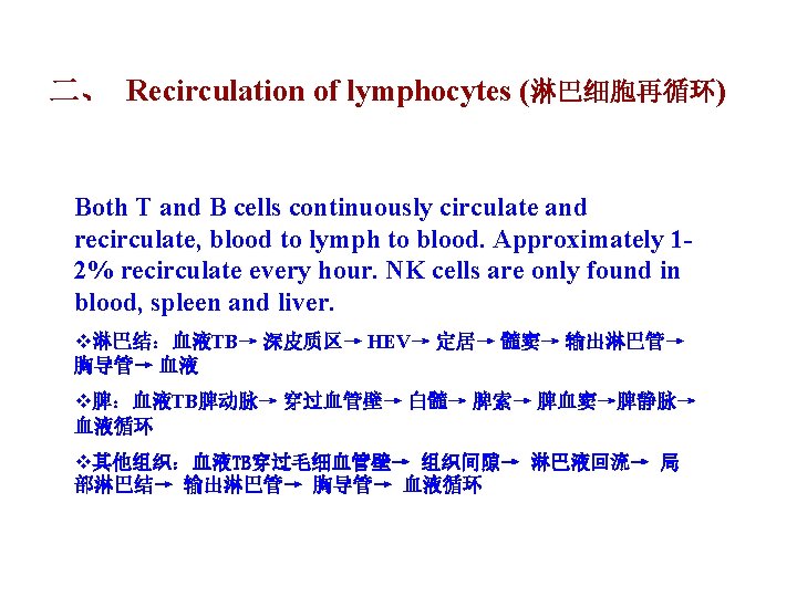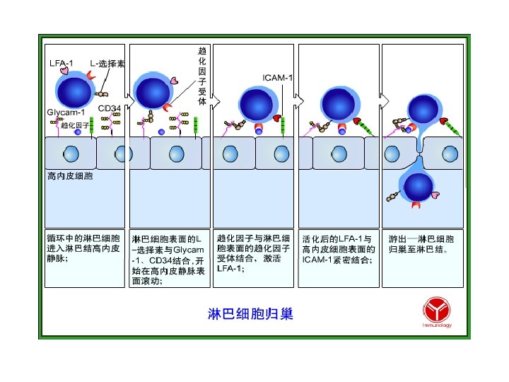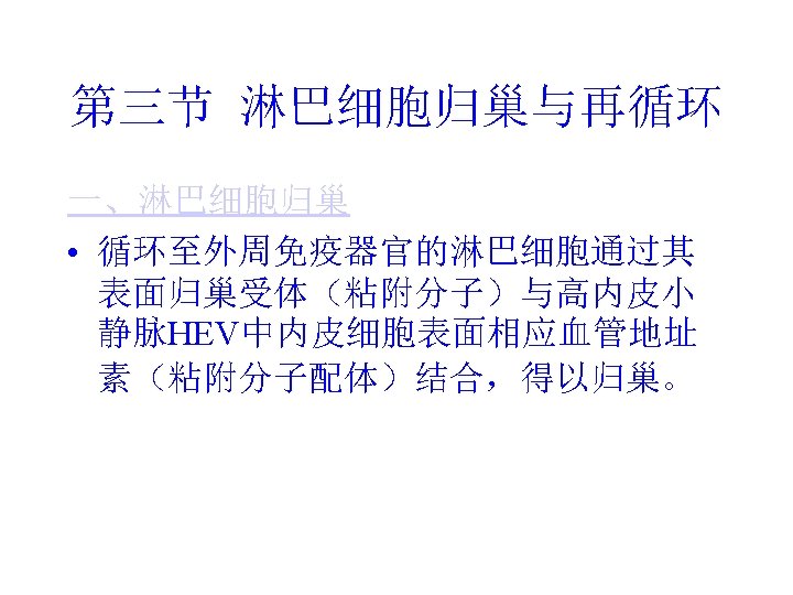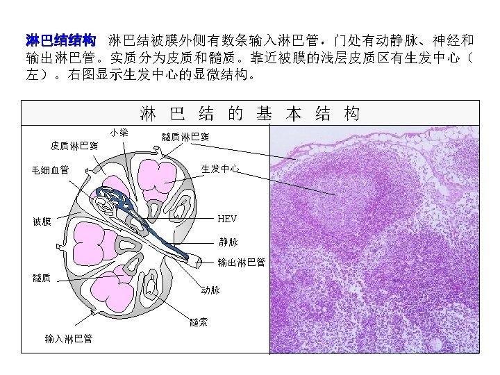 • High endothelial venule,HEV(高 内皮毛细血管后微 静脉):深皮质区内 皮细胞组成,淋巴细胞再 循环中起主要作用 高内皮小静脉是淋巴组织中的一种特殊小静脉(HEV are specialized venules found in lymphoid tissues). 淋巴细胞从血流中 迁移入淋巴组织依赖于高内皮小静脉细胞(Lymphocytes migrate from blood into lymphoid tissues by attaching to and migrating across the high endothelial cells of the vessels).