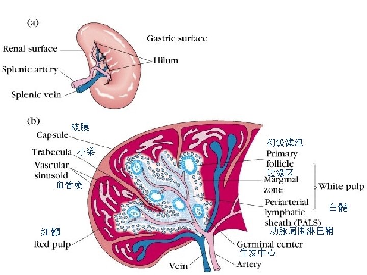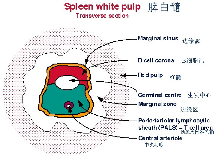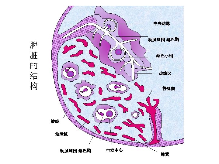 • 生发中心(germinal center) 次级淋巴组织中的生发中心是体液免疫应答过程中B细胞大量增 殖、选择、死亡的场所(Germinal centers in secondary lymphoid tissues are sites of intense B cell proliferation, selection, and death during Ab responses). 当激活的B细胞迁移进入淋巴结时生发中心 形成围绕滤泡树突细胞网络 (Germinal centers form around follicular dendritic cell network when activated B cells migrate into lymphoid follicles). 初级淋巴小结(primary follicle):静息的初始B细胞 次级淋巴小结(secondary follicle)= 生发中心(germinal center) :主要含受Ag刺激后增殖分化的B淋巴母细胞