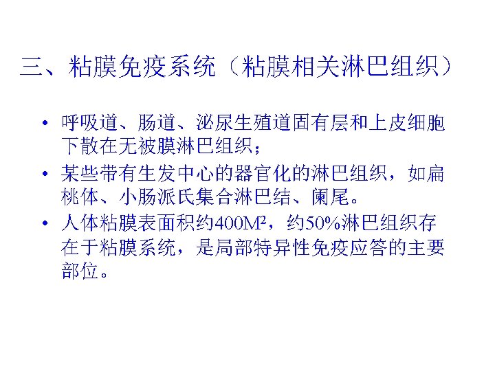 第二节 外周免疫组织和器官(Peripheral lymphoid organ) • 淋巴结(lymphnodes) • 脾脏(spleen) • 粘膜相关淋巴系统 ( mucosa-associated lymphoid system) • 扁桃体(tonsil)