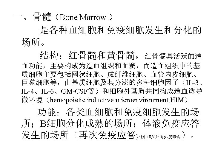 第一节 中枢免疫器官 (Central lymphoid organ) 骨髓和法氏囊(Bone Marrow and bursa of Fabricius) 胸腺(Thymus) A primary lymphoid organ that is required for the generation of immunocompetent CD 3 CD 4 and CD 3 CD 8 cells necessary for adaptive immune response.