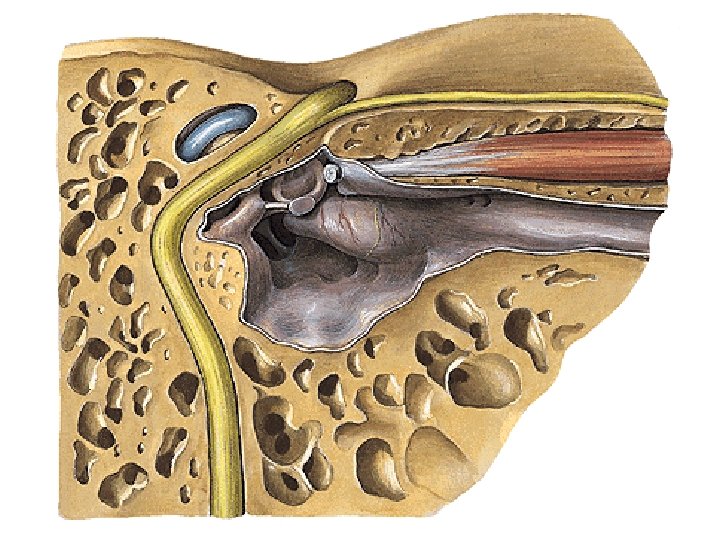 Paries caroticus: - nn. caroticotympanici - canalis musculotubarius – semicanalis m. tensoris tymp. - semicanalis tubae auditivae - processus cochleariformis
