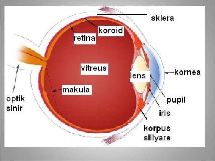 Organum Visus (Görme Organı) • Görme organı bulbus oculi’de denen göz küresidir. • Göz küresi; tunica fibrosa bulbi, tunica vasculosa bulbi ve tunica interna bulbi o. ü. 3 katmandan oluşur.