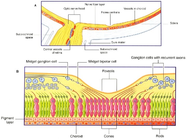 TUNICA INTERNA BULBI RETINA pars optica retinae pars caeca retinae (pars ciliaris retinae, pars iridica retinae) ora serrata pars optica retinae stratum pigmenti retinae (pigmented layer) stratum neuroepitheliale (layer of rods and cones) stratum ganglionare retinae (ganglionic layer of retina) stratum ganglionare nervi optici (ganglionic layer of optic nerve)