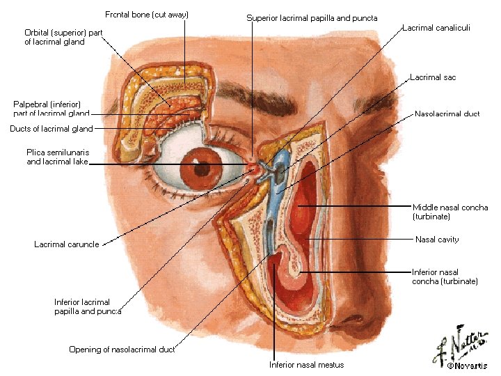 Tunica conjunctiva - conjunctiva tunica conjunctiva bulbi et palpebrarum conjunctiva of eyeball and eye lids fornix conjunctivae sup. et inf. Palpebrae – eye lids - tarsus sup. et inf. - lig. palpebrale med. et lat. - rima palpebrarum - rivus lacrimalis - angulus oculi medialis et lateralis - gll. tarsales (Meibomi) – flow into rima (sebaceous) - gll. ciliares (Molli) – openings are related with rima et cilie (apocrine sudorific) - gll. sebaceae (Zeisi) – openings are related with cilie (holocrine sebaceous) -- hordeolum