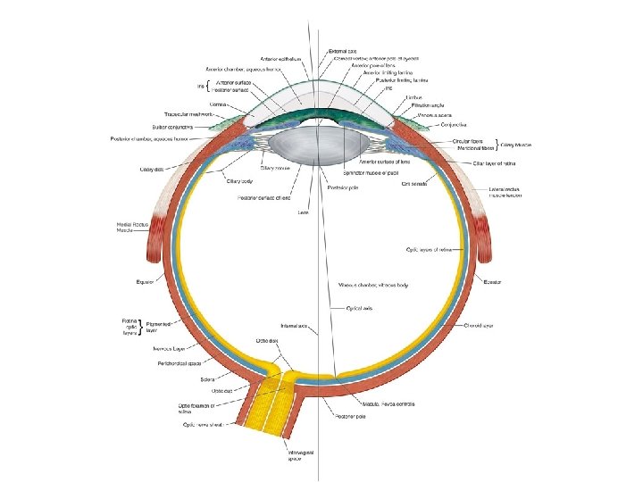 cornea iris tunica fibrosa bulbi tunica vasculosa bulbi sclera corpus ciliare choroidea linea visus axis oculi tunica interna bulbi retina discus nervi optici fovea centralis retinae