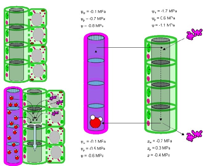 • Rozdíl vodních potenciálů: • Složky vodního potenciálu = tlaková (tlak okolních buněk, odčerpávání vody transpirací), osmotická („hustota“ roztoku), gravitační • Ψ = p – Π + hρg • Za normálních podmínek vodní potenciál čisté vody = 0, roztoky vždy < 0. • Tendence vody přecházet do míst se zápornějšími hodnotami (Ψ = tendence uvolňovat vodu)