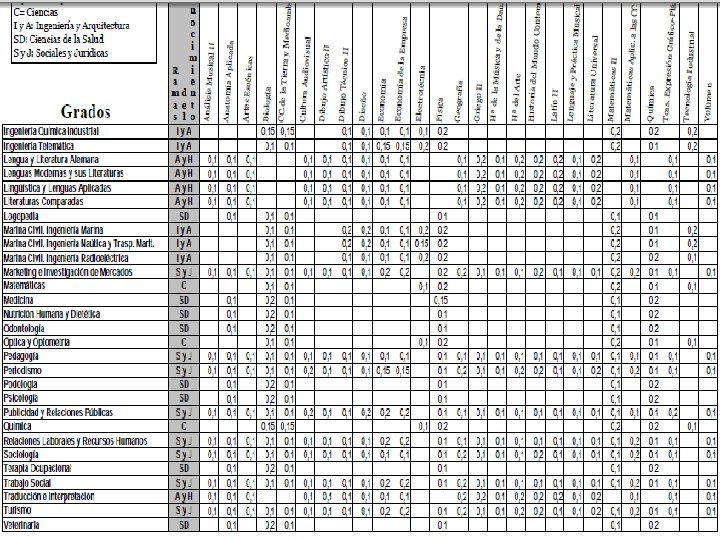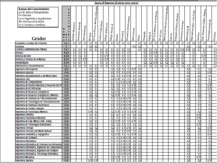 INCORPORACIÓN DE LA NOTA PONDERADA DE LAS MATERIAS DE LA FASE ESPECÍFICA A LA CALIFICACIÓN FINAL DE ACCESO n n n La incorporación de la nota de la fase específica a la nota final de acceso se realizará cuando el número de solicitudes al grado sea mayor que la oferta de plazas La nota de admisión incorporará las calificaciones de las materias de la fase específica en el caso de que dichas materias estén adscritas a la rama de conocimiento del título al que se quiera ser admitido de acuerdo al anexo I. El parámetro de ponderación (a ó b) de las materias de la fase específica será igual a 0, 1. Las universidades podrán elevar dicho parámetro hasta 0, 2 en aquellas materias que consideren más idóneas.