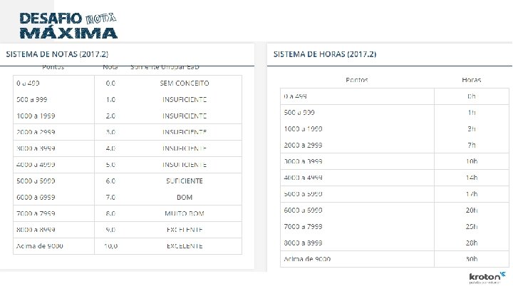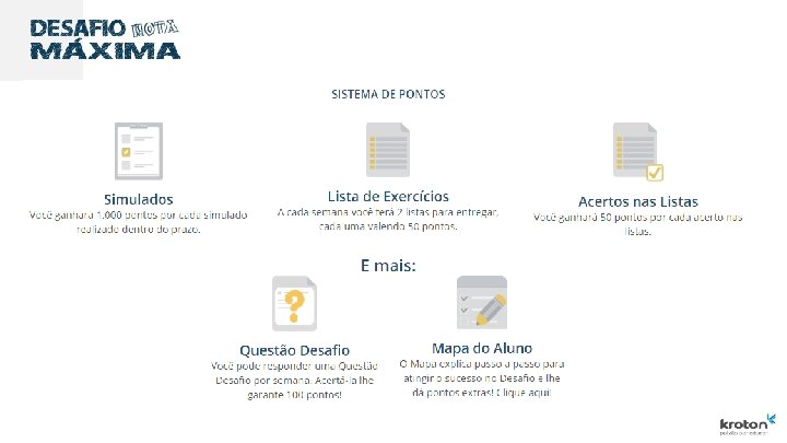 Explorando o Menu de Navegação – Informações No menu Informações, opção Pontos e Notas você terá acesso rápido a: de Pontuação: pontos de cada atividade e ü Sistema régua de conversão ü às Regras/Regulamento: aqui você tem a explicação completa e detalhada e todas as regras do Desafio Nota Máxima