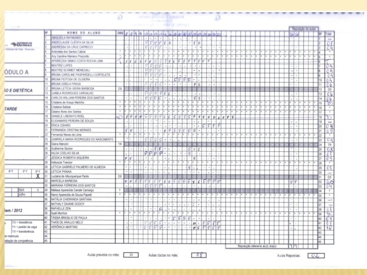 PREENCHIMENTO CORRETO DO DIÁRIO DA CLASSE Reposições de Aulas 1 1 8/8 15 15 22 22 . . . F F F F . . . . 29 Falta do Professor . 29 Reposições Referentes ao(s) dia(s): Aulas Previstas no Mês 10 Aulas Dadas no Mês 08 15 19 19 . . . 01 ______ F P . 02 2 F . . 03 5 F F F 04 11 . . . 05 0 4/7 11/ 7 Aulas Repostas Nº 03 TOTAL
