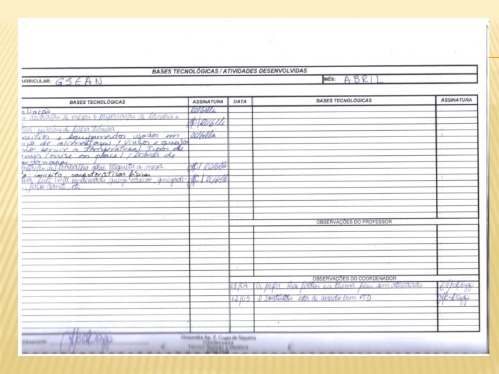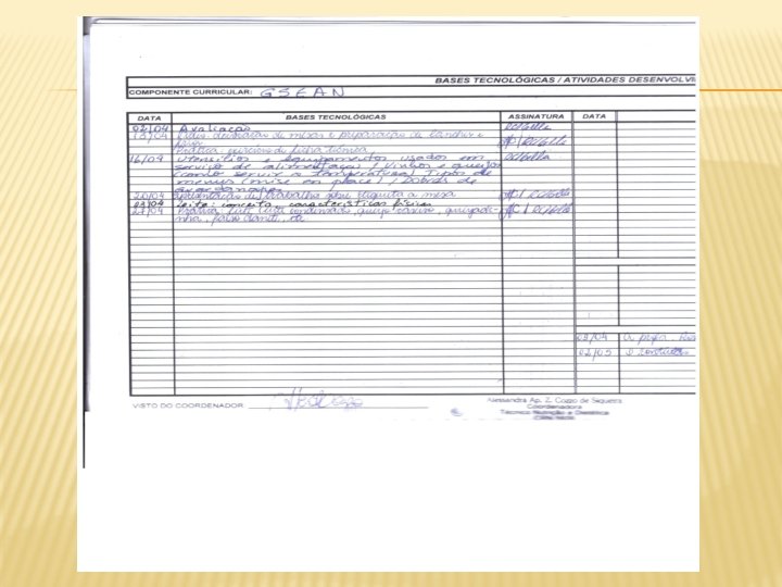Bases Tecnológicas/ Atividades Desenvolvidas Data Bases Tecnológicas 1/8 Apresentação do professor, das Assinatura Data Bases Tecnológicas Assinatura Bases tecnológicas e avaliações 8/8 Seminário sobre CLT Observações do Professor 15 15 Avaliação dissertativa Nos 3 e 4 faltaram na avaliação Observações do Coordenador Professor faltou dia 29/8 para fazer capacitação Assinatura do Coordenador: