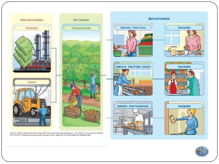 A cadeia produtiva da laranja envolve um grande número de agentes que operam basicamente em três estágios. O diagrama da Figura 8, que deve ser apresentado aos alunos, ilustra esses estágios: antes das fazendas, nas fazendas e após as fazendas. Para a interpretação e análise da Figura 8, é proposto um roteiro de questões.