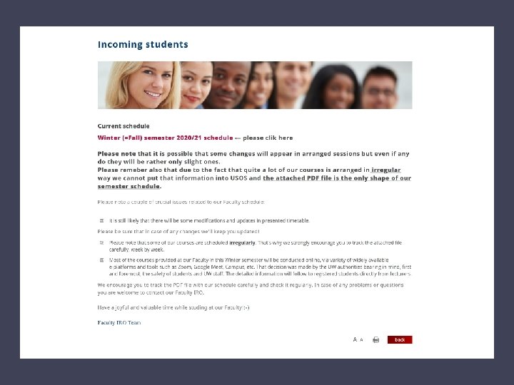 Timetable Where can I find the class schedule? • On the Fo. M website • On the information board next to C 218 Also: • Irregular, intensive, NOT available in USOS IMPORTANT: please, check your email regularly since any urgent modifications in our courses schedule are usually announced to you via email!!!