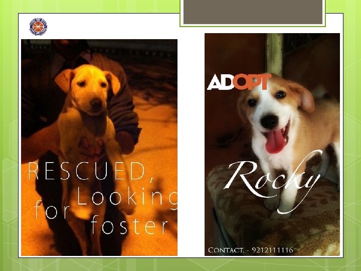 FAUNA POLICE Established by Mr. Abhinav Srihan in 2010. Philosophy – Treat rescued animals physically as well as emotionally 2 centres in Delhi: Dogs’ Inn (Noida) & Birds’ Aviary (Mayur Vihar). Operate a bird helpline number as well. Radically different from other animal care centres.
