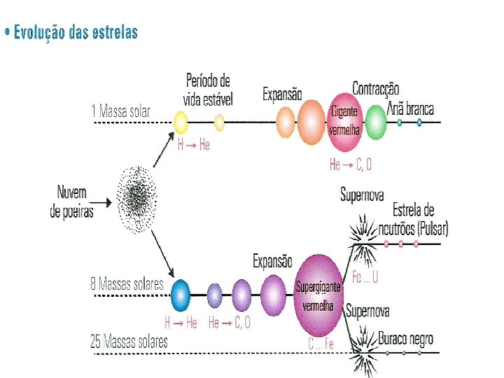 VIDA DE UMA ESTRELA • A duração da fase principal da vida de uma estrela, depende da sua massa inicial, M 0. Esta é determinante na evolução que a estrela pode experimentar. A relação entre essa massa inicial e a do Sol será determinante para a sequência das transformações que irão ocorrer.