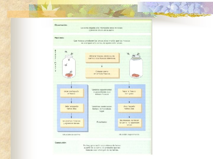 Experimento de Redi n Hasta mediados del siglo 17 la mayoría de las personas aceptaban la teoría de la generación espontánea. n Francisco Redi (1626 -1697), médico y científico italiano, no estaba convencido de que las moscas salían de la carne podrida. n Redi observó que las moscas se posaban en la carne podrida y que en ésta aparecían pequeños organismos blancos como gusanos, los mismos que se alimentaban de la carne podrida. Finalmente, los gusanos dejaban de moverse y se transformaban en pequeñas estructuras ovaladas y notó que de estas estructuras salían moscas parecidas a las que primero se posaron sobre la carne podrida. Redi formuló la hipótesis “que las moscas que se habían desarrollado de los gusanos eran la descendencia de las moscas originales” n Redi diseñó un experimento para determinar si los gusanos se desarrollaban en caso de no dejar que ninguna mosca entre en contacto con la carne podrida. Puso carne en ocho frascos y selló cuatro de ellos. Después de un corto período de tiempo habían gusanos solo en los frascos abiertos. Concluyó que los gusanos aparecían en la carne descompuesta solo si las moscas habían puesto sus huevos allí. Ciclo de vida de la mosca