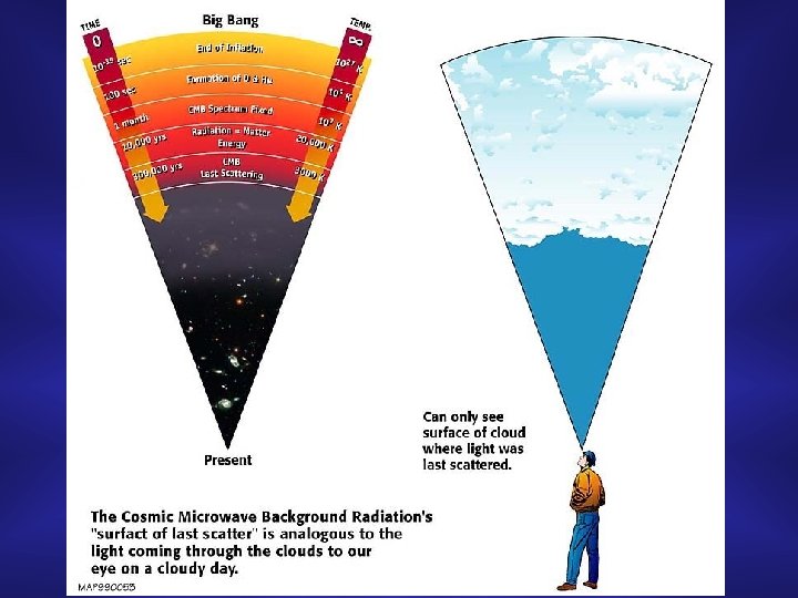 Comparación de los mapas elaborados cpn COBE y con WMAP Resultados del WMAP • Las primeras estrellas se formaron 200 millones de años luego del Big Bang. • La radiación cósmica de fondo se originó 379, 000 años después del Big Bang. • H 0 = 71 ± 4 km/sec/Mpc