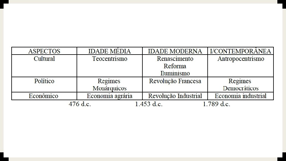 Reflexões para um tempo dinâmico ■ É importante ressaltar que este clima de mudanças e incertezas, contrastava profundamente com a ordem cultural da idade média. ■ No período medieval, com o predomínio das concepções cristãs, o tempo e a sociedade eram vistos como algo fixo e imutável, reflexo, de alguma forma, da vontade do Deus criador. ■ A sociedade, como tal, não era uma questão percebida pelas pessoas e não tinha muito destaque no pensamento.