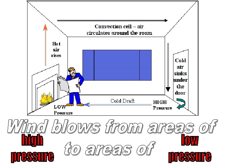 low pressure high pressure warm or cold air rising or sinking clouds or no clouds clockwise or counterclockwise wind direction winds toward or away from the center
