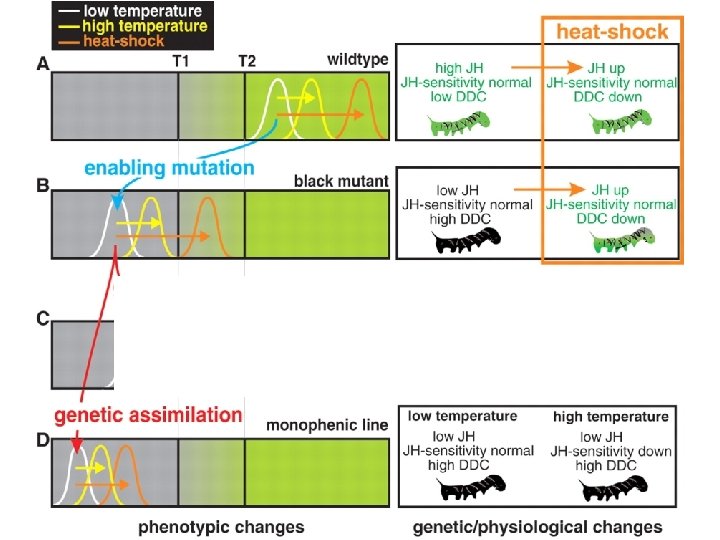 § Heat shock moves the threshold so that now some individuals exhibit the novel wing phenotype. POPULATION MEAN § Selection on the novel type advances the population mean so that now some individuals exhibit the novel phenotype even without heat shock.