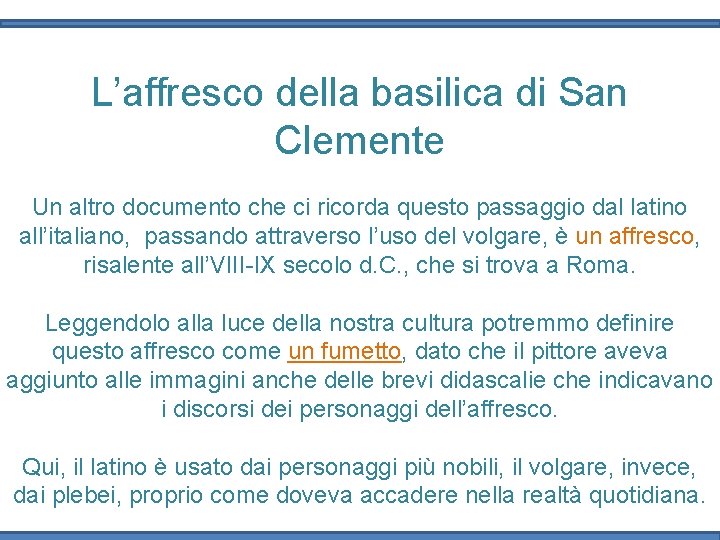 L’affresco della basilica di San Clemente Un altro documento che ci ricorda questo passaggio dal latino all’italiano, passando attraverso l’uso del volgare, è un affresco, risalente all’VIII-IX secolo d. C. , che si trova a Roma. Leggendolo alla luce della nostra cultura potremmo definire questo affresco come un fumetto, dato che il pittore aveva aggiunto alle immagini anche delle brevi didascalie che indicavano i discorsi dei personaggi dell’affresco. Qui, il latino è usato dai personaggi più nobili, il volgare, invece, dai plebei, proprio come doveva accadere nella realtà quotidiana.