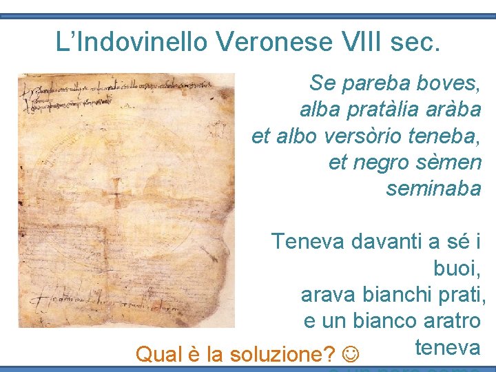 L’Indovinello Veronese VIII sec. Se pareba boves, alba pratàlia aràba et albo versòrio teneba, et negro sèmen seminaba Teneva davanti a sé i buoi, arava bianchi prati, e un bianco aratro teneva Qual è la soluzione?