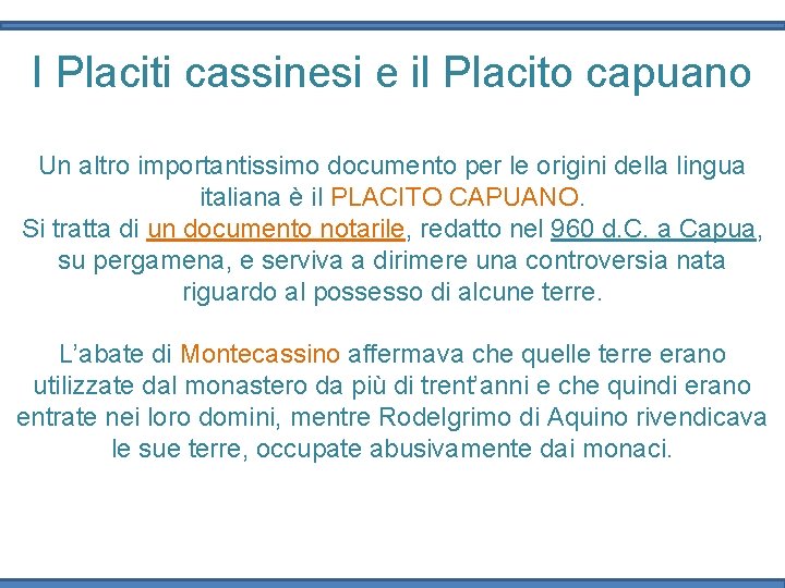 I Placiti cassinesi e il Placito capuano Un altro importantissimo documento per le origini della lingua italiana è il PLACITO CAPUANO. Si tratta di un documento notarile, redatto nel 960 d. C. a Capua, su pergamena, e serviva a dirimere una controversia nata riguardo al possesso di alcune terre. L’abate di Montecassino affermava che quelle terre erano utilizzate dal monastero da più di trent’anni e che quindi erano entrate nei loro domini, mentre Rodelgrimo di Aquino rivendicava le sue terre, occupate abusivamente dai monaci.