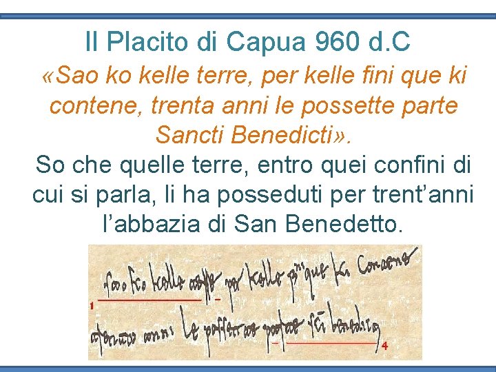 Il Placito di Capua 960 d. C «Sao ko kelle terre, per kelle fini que ki contene, trenta anni le possette parte Sancti Benedicti» . So che quelle terre, entro quei confini di cui si parla, li ha posseduti per trent’anni l’abbazia di San Benedetto.