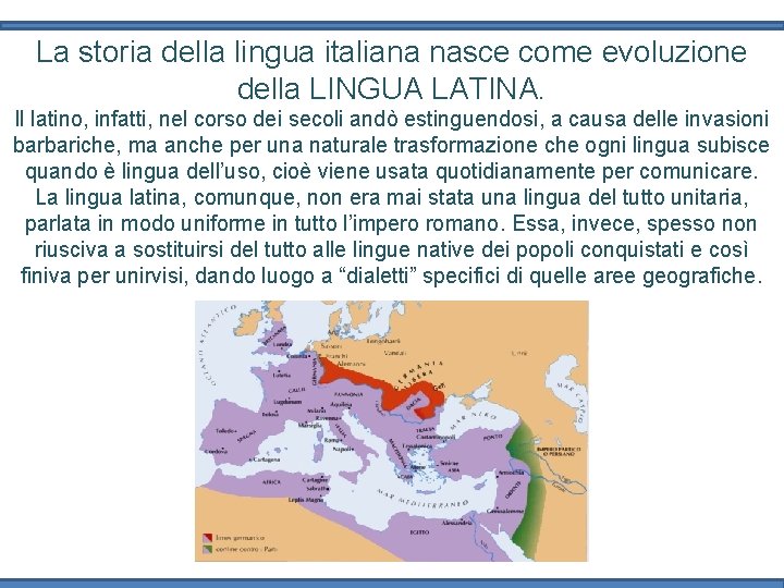 La storia della lingua italiana nasce come evoluzione della LINGUA LATINA. Il latino, infatti, nel corso dei secoli andò estinguendosi, a causa delle invasioni barbariche, ma anche per una naturale trasformazione che ogni lingua subisce quando è lingua dell’uso, cioè viene usata quotidianamente per comunicare. La lingua latina, comunque, non era mai stata una lingua del tutto unitaria, parlata in modo uniforme in tutto l’impero romano. Essa, invece, spesso non riusciva a sostituirsi del tutto alle lingue native dei popoli conquistati e così finiva per unirvisi, dando luogo a “dialetti” specifici di quelle aree geografiche.