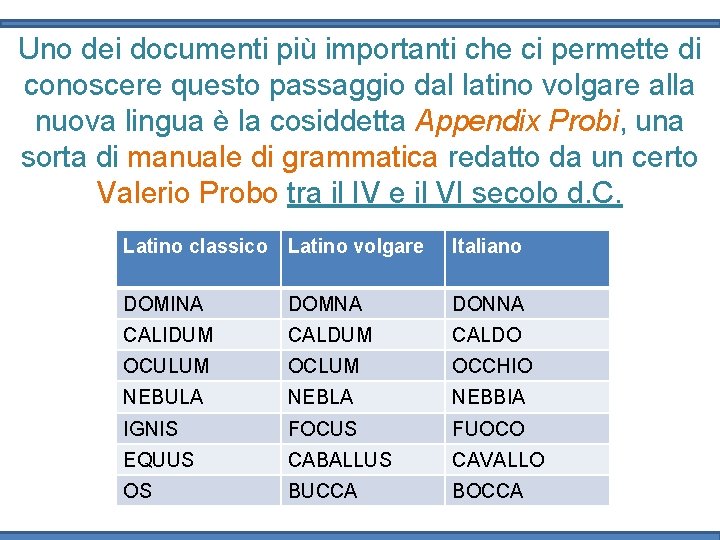Uno dei documenti più importanti che ci permette di conoscere questo passaggio dal latino volgare alla nuova lingua è la cosiddetta Appendix Probi, una sorta di manuale di grammatica redatto da un certo Valerio Probo tra il IV e il VI secolo d. C. Latino classico Latino volgare Italiano DOMINA DOMNA DONNA CALIDUM CALDO OCULUM OCCHIO NEBULA NEBBIA IGNIS FOCUS FUOCO EQUUS CABALLUS CAVALLO OS BUCCA BOCCA