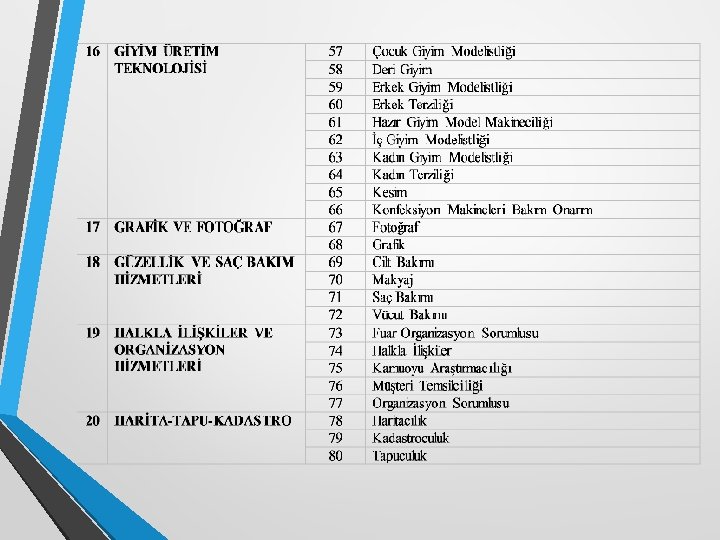 MESLEKİ VE TEKNİK ANADOLU LİSESİ • KIZ MESLEK LİSESİ ÜAile ve tüketici bilimleri alanı, giyim ve üretim teknolojileri alanı, çocuk gelişimi ve eğitimi alanı, güzellik ve saç bakım alanı, yiyecek ve içecek hizmetleri alanı ve el sanatları teknolojisi gibi alanlarda mesleğe yönelik teknik elemanların yetiştirildiği okullardır. ÜÖğrenciler bu okullardan mezun olduklarında alanları ile ilgili iş yerlerinde çalışabilecekleri gibi isterlerse yükseköğretim kurumlarına da devam edebilirler.