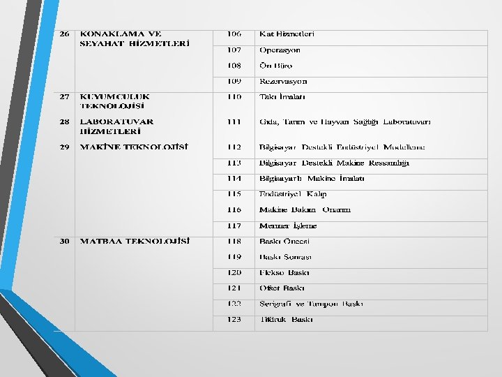 MESLEKİ VE TEKNİK ANADOLU LİSESİ • OTELCİLİK VE TURİZM MESLEK LİSESİ q. Turizm ve bunun temel alt yapısını oluşturan konaklama sektörünün ihtiyaç duyduğu nitelikli elemanları yetiştiren okullardır. q. Bu okullarda öğrenim gören öğrenciler her yıl Ekim-Mart ayları arasında teorik ve uygulamalı eğitimlerini okulda; Nisan -Eylül ayları arasında uygulamalı eğitimlerini bu alanda faaliyet gösteren otellerde veya diğer turistik tesislerde yapmaktadırlar. q. Bilgisayar ve yabancı dil bilen nitelikli meslek elemanı olarak yetişen öğrenciler, geniş iş imkanına sahiptirler