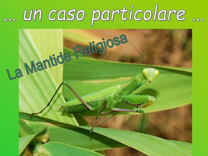 Mantis religiosa La mantide religiosa è senza dubbio uno degli insetti più spettacolari della natura e gli uomini l’hanno da sempre considerata con timore e rispetto. Con timore, perchè, guardandola da vicino, e dimenticando la sua eleganza naturale, siamo colpiti dall’aspetto mostruoso del suo capo. Con rispetto, a causa della sua postura che sembra essere quella della preghiera: le sue zampe sollevate fanno pensare a mani giunte.