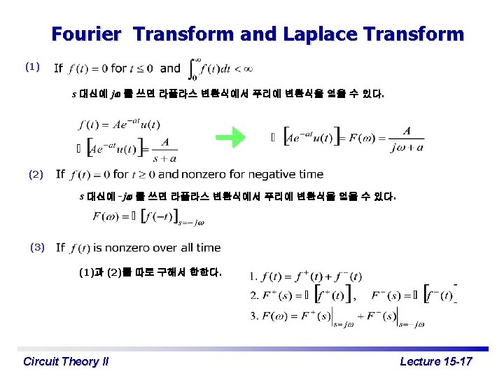 Fourier Transform 여기서 T 가 무한대로 커지면 여기서 F(jw) 는 f(t) 의 Fourier 변환이다. Fourier 역변 환 Fourier 역변환 유도 Circuit Theory II Lecture 15 -12
