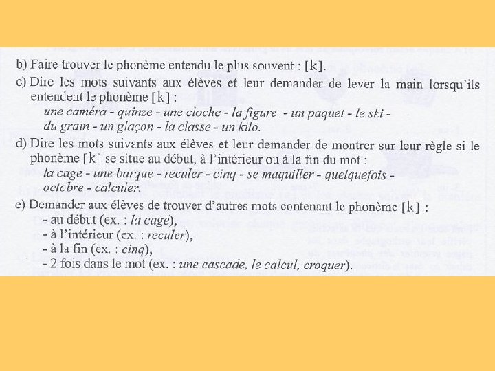 Bilan phonie graphie: la démarche - présentation de deux phonèmes en opposition avec deux phrases phase articulatoire mettant en évidence les caractéristiques du phonème - étude des graphies d'un des deux phonèmes *phase orale -écoute d’un texte et identification du phonème -repérage du phonème et de sa place dans des mots -recherche de mots contenant le phonème dégagé * phase écrite -lecture du texte et identification des graphèmes correspondant au phonème étudié, -recherche de mots contenant ce phonème dans la liste alphabétique des mots à étudier -lecture sur la page du cahier « Je connais les graphies des phonèmes » de la partie consacrée au phonème étudié et remarques sur la fréquence des graphèmes -lecture des mots à mémoriser * exercices pour écrire des mots (ceux à mémoriser ou d’autres contenant le phonème étudié), seuls, dans une phrase ou dans un court texte
