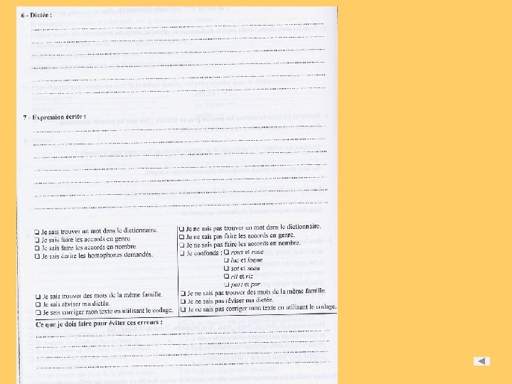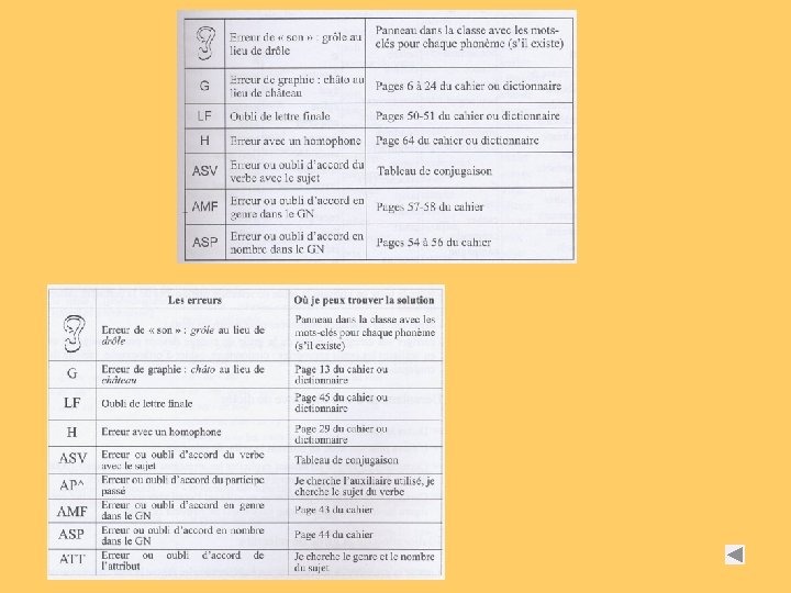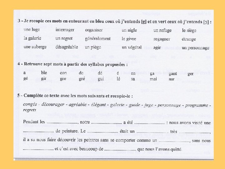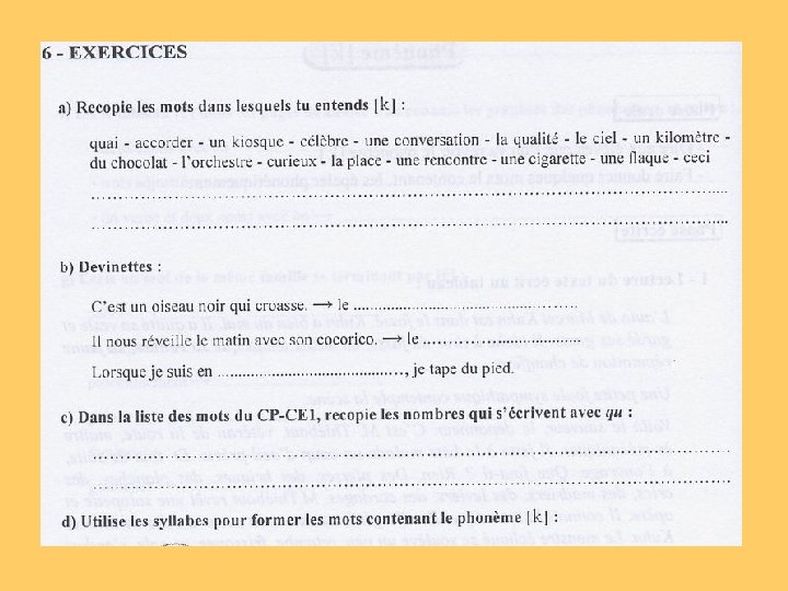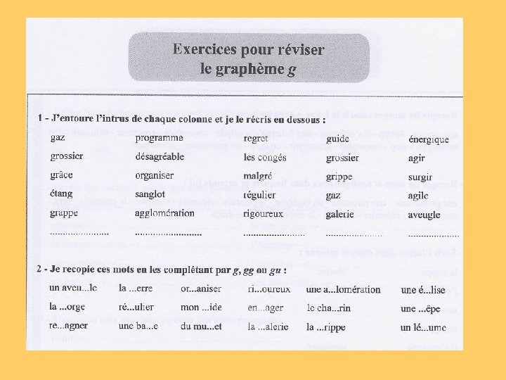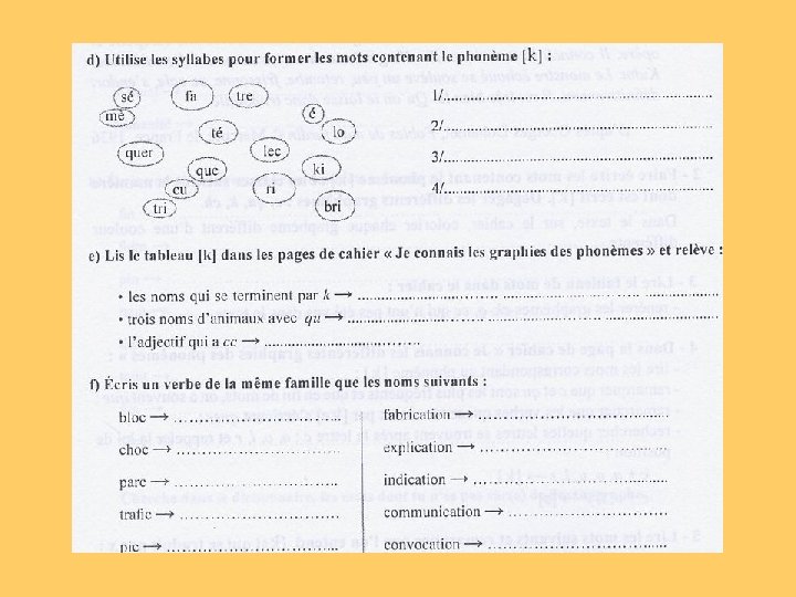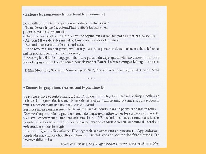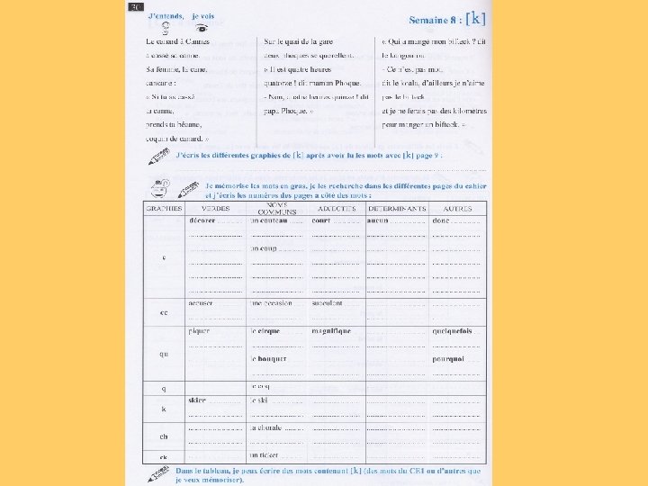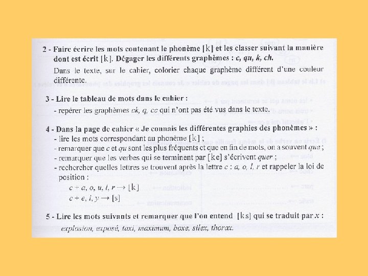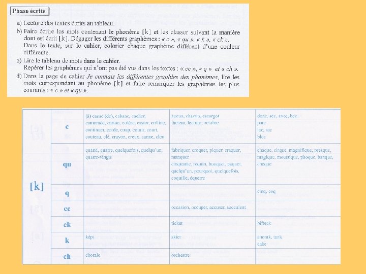 en étudiant les graphies liées aux phonèmes et en repérant des probabilités de graphie - lors des séquences « bilan phonie-graphie » en mémorisant des mots choisis pour leur fréquence en identifiant des régularités dans l’orthographe de ces mots, en découvrant des principes de fonctionnement - lors des séquences « mémorisation de mots » en structurant et en appliquant les principes de fonctionnement découverts dans l’orthographe des mots - lors des séquences « faire le point sur » en changeant le temps et la personne dans des textes - lors des séquences de « transposition de textes » en construisant et en utilisant une typologie des erreurs en faisant expliciter les stratégies orthographiques employées en utilisant des instruments permettant de réviser l’orthographe d’un texte - lors des séquences « dictées »
