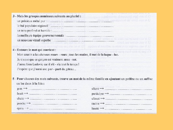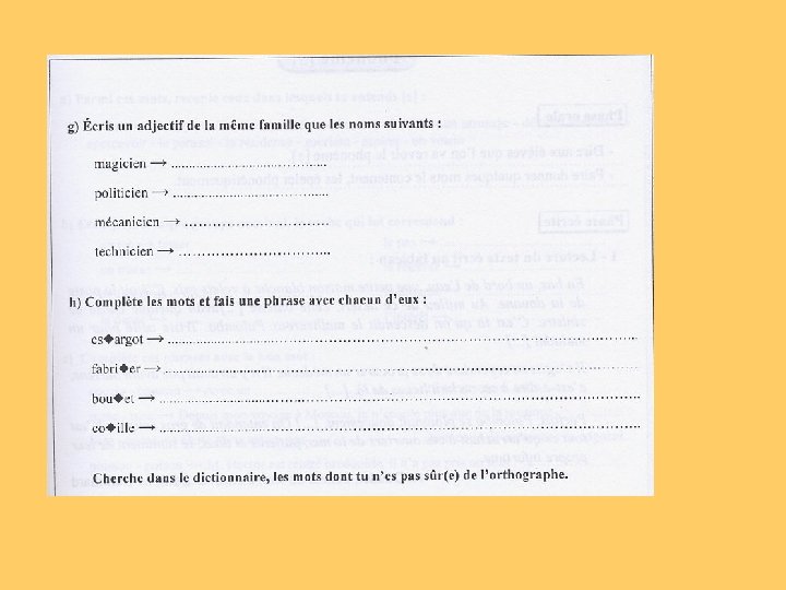 CM 1: -les préfixes: in-im; dé; re; en-em; sur; a -les suffixes: -eur, -teur, -ateur (arroseur, constructeur, indicateur); -able (comparable); -ment et -ement (silencieusement, , tremblement); -ade(grillade); - iste (trompettiste) ; -age (arrosage); -tion, -ation, -ition (construction-conservationrépétition); -ie, -erie (copie, conserverie); -et, -ette (muret, clochette); -ant (charmant); -té, -eté, -tié (communauté, pureté, humidité) ; -ée (montée, journée) ; -eux (aventureux) ; -ier, -ière (serrurier, volière) ; -ure (couverture, blessure), -oire (miroir, mâchoire, territoire) ; -ique (océanique) ; -ible (paisible) CM 2: Les noms féminins terminés par le son [œr] Les noms féminins terminés par le son [i] Les noms terminés par le son [war] Les noms féminins terminés par –ance ou –ence Les noms féminins terminés par le son [te]