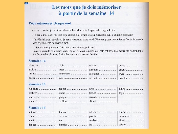 La mémorisation de mots Quels mots? La programmation de l’étude des mots dans l’année Quelle mémorisation? Une mémorisation raisonnée des mots au cours de laquelle l’élève écrit le mot à mémoriser plusieurs fois - il écrit le mot dans des groupes nominaux en réalisant les accords (pâle : des teints pâles), dans des groupes syntaxiques (briser : ces informations me brisent le cœur) et/ou en employant des homonymes grammaticaux (contenir : ce seau contient dix litres ; elle se contient pour ne pas pleurer)