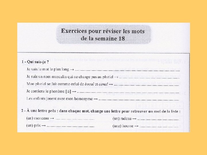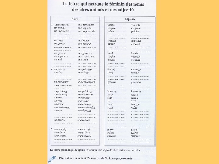 Connaissances au niveau des morphogrammes les marques de rappel : dans les mots, certaines lettres rappellent l’appartenance à une famille de mots (chapeau-chapelier, main-manuel etc. ) ou la traduction du genre (petit-petite, blanc-blanche etc. ) la construction des mots avec les préfixes et les suffixes les marques qui apparaissent ou disparaissent : la relation sujet-verbe: marques de temps et de personnes l’accord dans le groupe nominal: féminin et pluriel des noms et des adjectifs Connaissances au niveau des logogrammes la distinction entre les homophones: deux ou plusieurs mots ayant la même prononciation et des graphies différentes