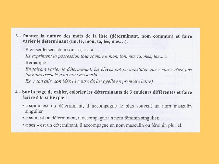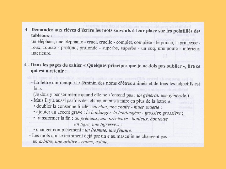 Le déroulement d’une séquence « Faire le point sur » -Observer les listes du cahier -Verbaliser les remarques, dégager un principe de fonctionnement -Elaborer un texte reprenant le principe dégagé ou le lire dans les pages « Quelques principes que je ne dois pas oublier » -Réaliser des exercices
