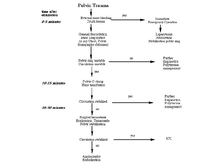• Clinical evaluation : – Perform primary survey – Initiate resuscitation. Adress life threatening injuries – In suspicion of pelvic fracture, check : Leg length discrepancy Pelvic instability test can only be performed once Hematoma in flank, around iliac crest, perineum Urethral injury often accompanies pelvic fracture blood in MUE, butterfly hematoma, floating prostate • Vaginal or rectal perforation by fracture fragments • Pelvic AP X-ray using portable X-ray • FAST Focused Assesment Sonography for Trauma • •
