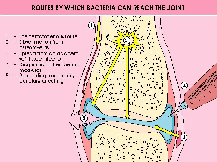 SEPTIC ARTHRITIS • Root of infection: – Blood stream – Contiguous infection – Direct inoculation: • Injection: 0. 0002 • Arthroscopic surgery: < 0. 005 • Animal or human bite
