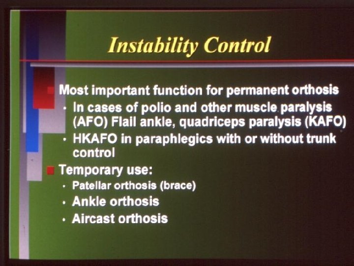 Instability control : Knee Orthosis § Knee Orthosis is a knee brace which controls of knee instability following Ligaments injuries like collateral ligaments or cruciate ligaments § They stop lateral instability and control knee movements between certain degrees