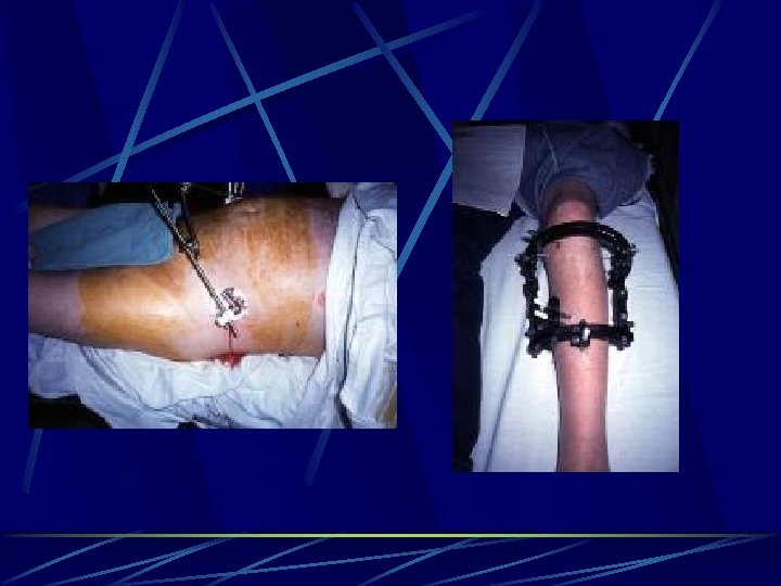 External fixation In 1907 in Alvin Lambotte, 1952 Ilizarev provides stabilization at a distance from the fracture site without interfering with the soft tissue structures maintains length, alignment, and rotation without requiring casting allows inspection types: Wagner, Orthofix, Unifix, Indications Open fractures with significant soft tissue disruption (eg, type II or III open fractures) Soft tissue injury (eg, burns) Pelvic fractures (temporarily) Severely comminuted and unstable fractures Fractures that are associated with bony deficits Limb-lengthening procedures Fractures associated with infection or nonunion arthrodesis