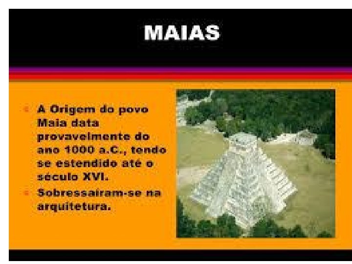 CIDADES-ESTADO MAIAS -Organização política e administrativa (Cidades-Estado: cidades independentes entre si, ou seja, tinham governos, leis e costumes próprios. ) Destacaram-se: Copán, Chichén. Itzá, Maiapán, Uxmal, Palenque e Tikal.
