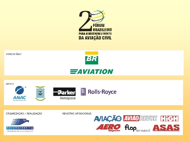 PÚBLICO ALVO • Fabricantes e distribuidores de Aeronaves • Linhas Aéreas Regulares • Fornecedores de Tecnologia, Produtos e Serviços para Aviação • Fabricantes de Peças e Componentes • Indústrias Petrolíferas e Distribuidores • Distribuidores e Representantes Aeronáuticos • Infra-estrutura e Administração Aeroportuária • Empresas de Manutenção