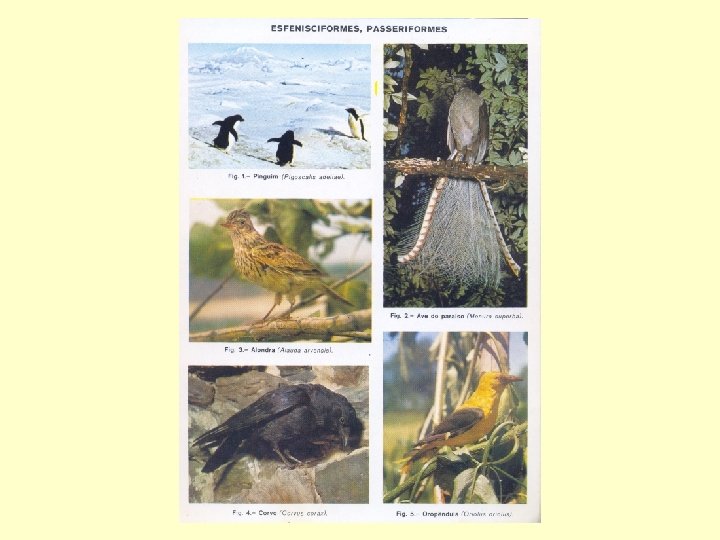 Classificação (STORER E USINGER, 1979) As aves estão divididas em duas sub-classes: a - Subclasse Archaeornithes - Aves ancestrais b - Subclasse Neornithes - Aves verdadeiras, com duas superordens extintas e 3 viventes. b. 1 - Superordem Impennes Ordem Sphenisciformes - Pinguins. Sem dentes; não voam; membros anteriores (“asas”) semelhantes a remos; 4 artelhos; penas pequenas, semelhantes a escamas; panículo adiposo espesso, ficam em posição ereta sobre os metatarsos; mergulham rapidamente e nadam por impulso do corpo b. 2 - Superordem Palaeognathae - Aves corredoras; terrestres (emas, emus, moas, quivis, inhambus, avestruzes); sem dentes, asas reduzidas, geralmente sem capacidade de vôo. b. 3 - Superordem Neognathae - Aves modernas. Sem dentes, esterno com quilha, asas desenvolvidas; 5 ou 6 vértebras caudais, pigóstilo desenvolvido, membros anteriores, com metacarpiais fundidos e dedos incluídos na asa. Esta superordem encontra-se dividida em 22 ordens: