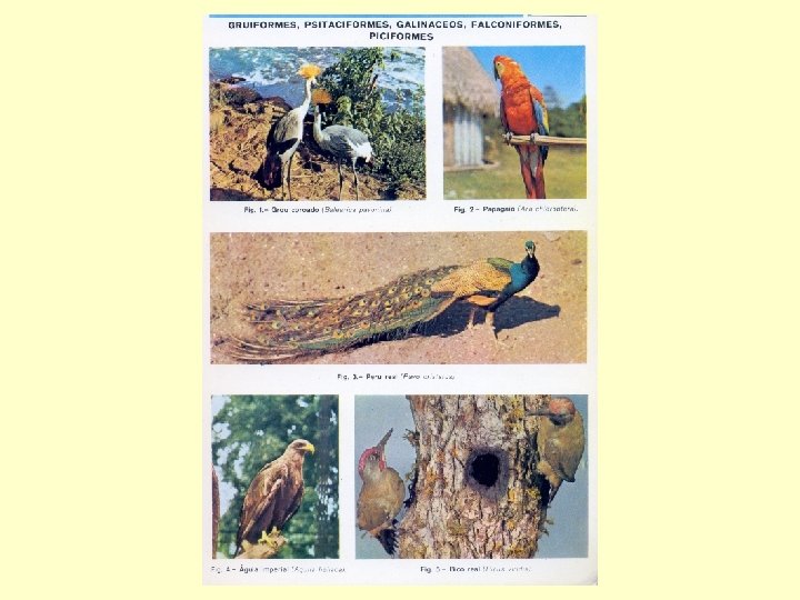Ordem Gaviiformes (Gavia immer) Ordem Podicipediformes - Mergulhões Ordem Procellariiformes - Albatrozes Ordem Pelecaniformes - Pelicanos Ordem Ciconiiformes - Garças, cegonhas, flamingos Ordem Anseriformes - Patos, gansos e cisnes Ordem Falconiformes - urubus, abutres, gaviões, falcões, águias. Ordem Galliformes - Codornizes, faisões, perus, galo doméstico. Ordem Gruiformes - Saracuras, galinhas d’água Ordem Diatrymiformes - Extinta Ordem Charadriiformes - Aves ribeirinhas e aquáticas, gaivotas, etc. Ordem Columbiformes - Pombos Ordem Psittaciformes - Papagaios Ordem Cuculiformes - Anus, cucos Ordem Strigiformes - Corujas Ordem Caprimulgiformes - Curiangos Ordem Apodiformes - Beija-flores Ordem Coliiformes - Colius (África) Ordem Trogoniformes - Surucuás Ordem Coraciiformes - Arirambas (América do Norte) Ordem Piciformes - Pica-paus, tucanos Ordem Passeriformes - Passarinhos.